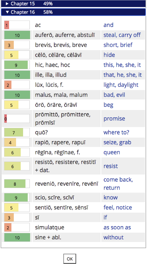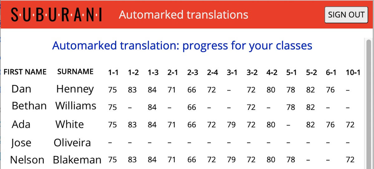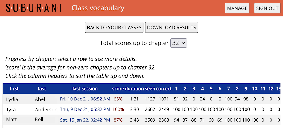The Suburani vocabulary trainer provides each student (and their teacher) with both an overview and a detailed analysis of their vocabulary acquisition. Using spaced repetition, the software focuses on the vocabulary which the student needs to practise more, shows when they last logged in, how long they have spent on the trainer, their overall score to date, and precise word-level progress.