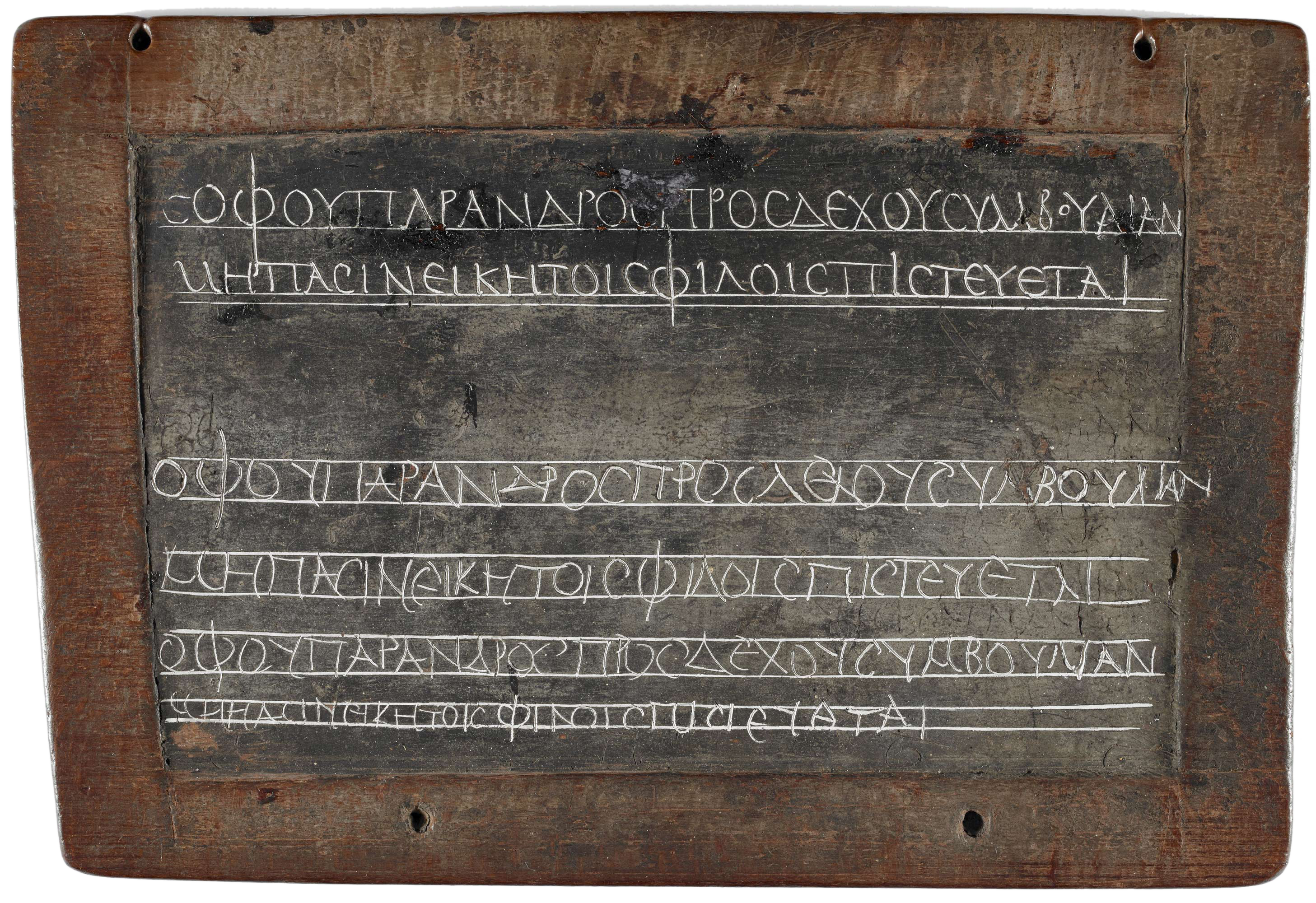 This wooden tablet covered in black wax and engraved with Greek writing is one of a pair, which would have been tied together. The tablets belonged to a schoolchild in Egypt in the second century ad. The top two lines are a quotation from the Greek poet Menander, and were probably written by the teacher. The child has then copied out the lines twice. Has the child made any mistakes?