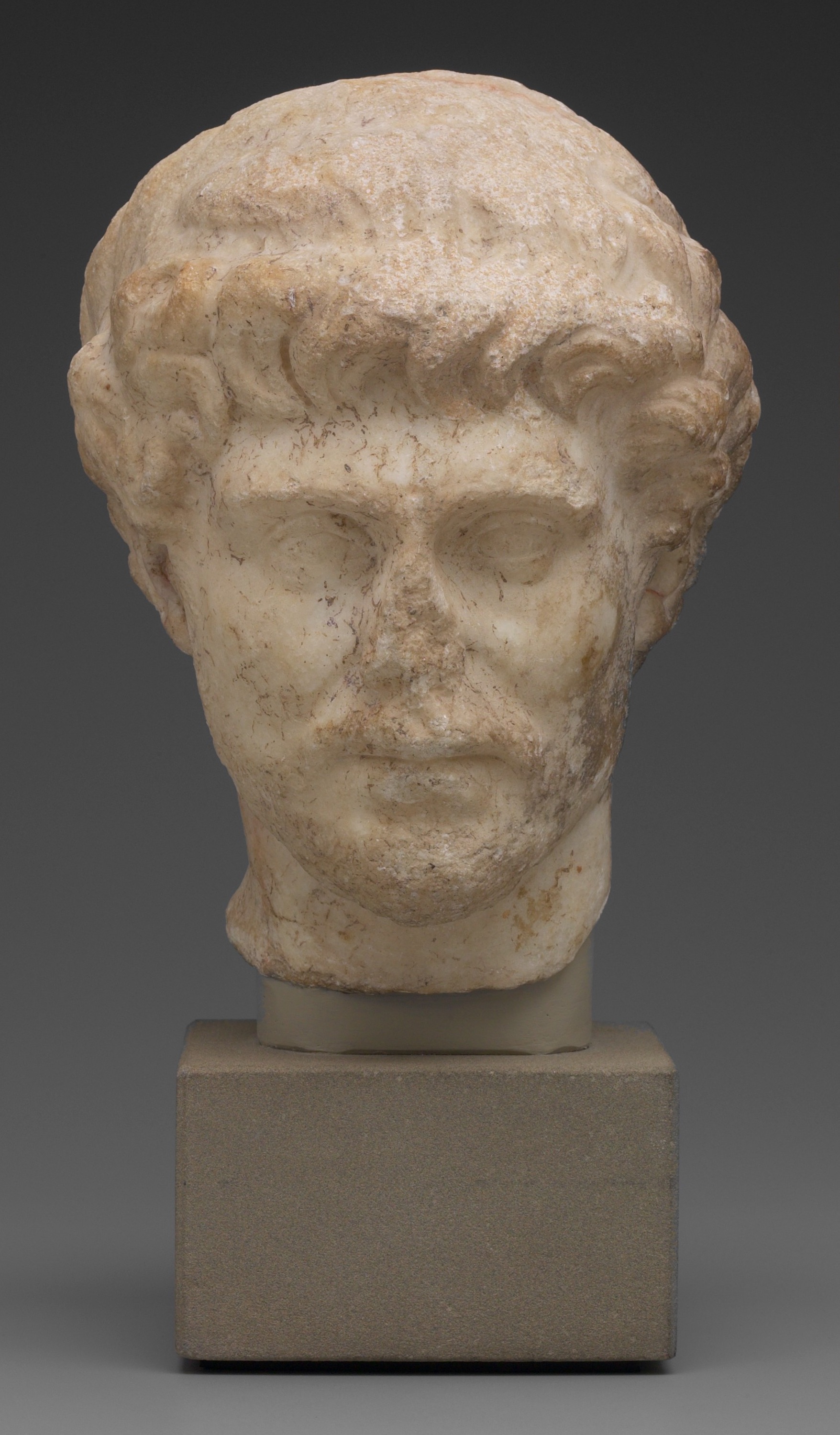 A portrait of Nero recarved after his death into a likeness of another man. Features such as the receding lower lip and famous curled hairstyle help identify this head as belonging originally to a statue of Nero.