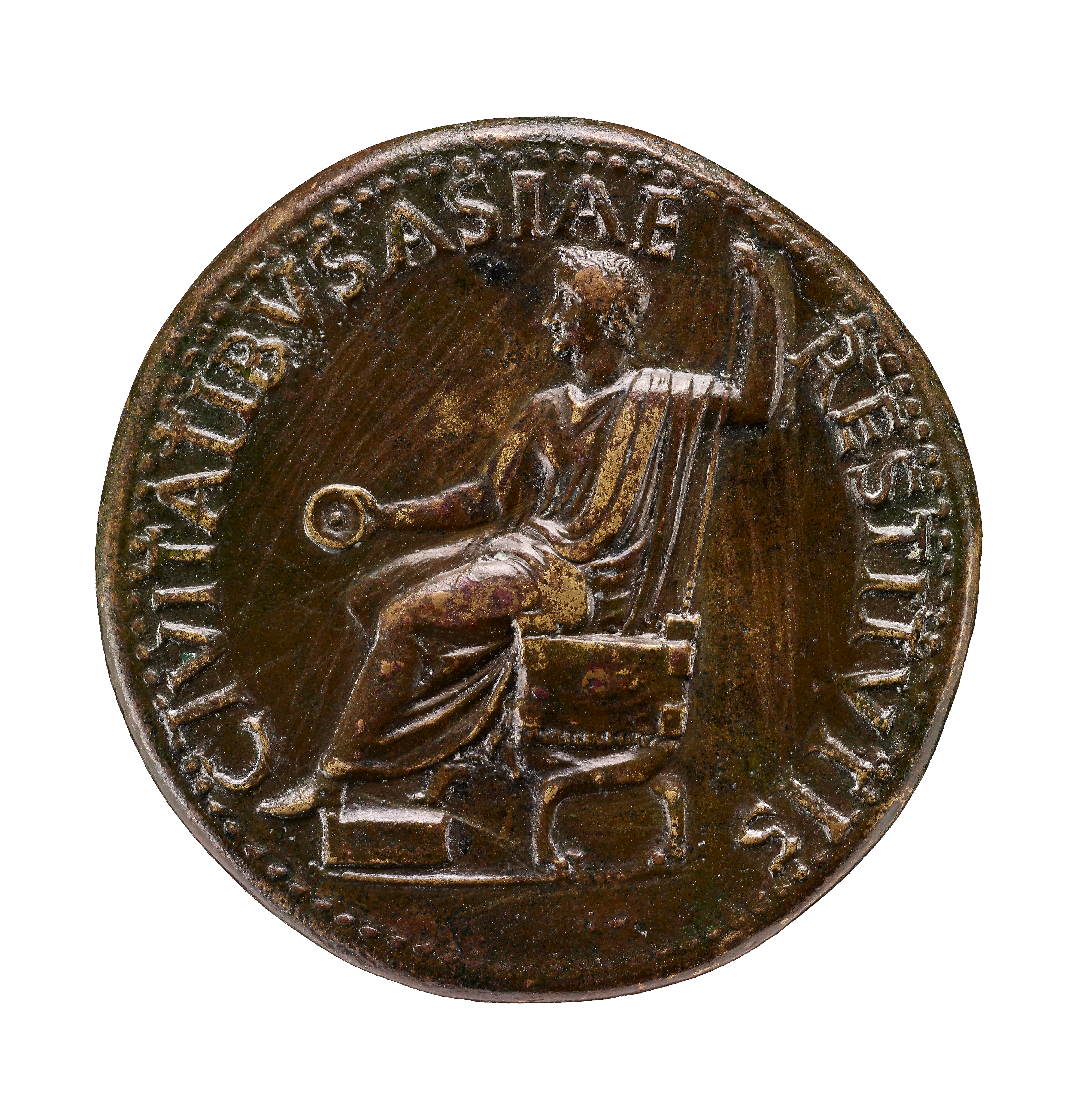 This coin, minted in Rome in ad 22–23, shows the seated Tiberius. Around him is inscribed: