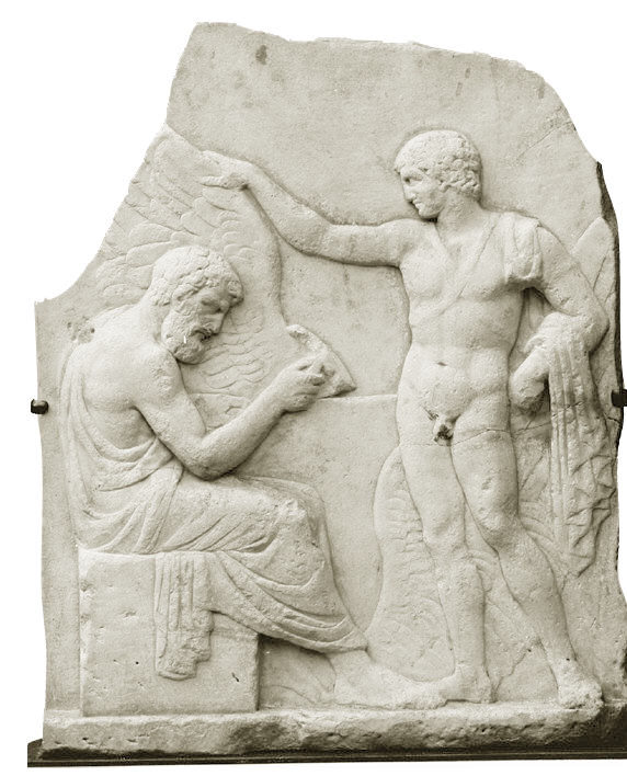A marble relief showing the craftsman Daedalus fashioning and fitting wings for his son Icarus.