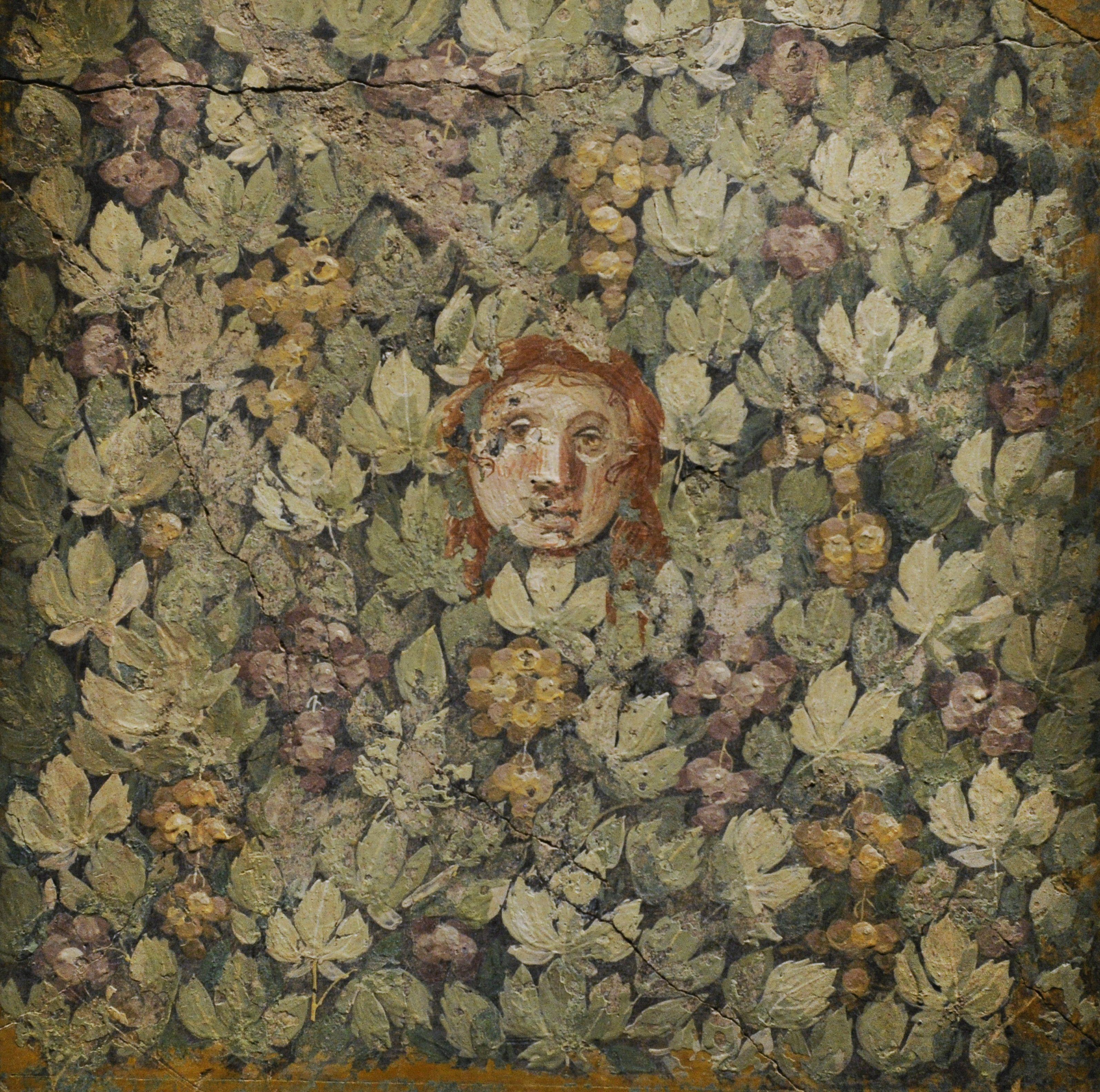This wall painting, from the House of Popidius Priscus in Pompeii, shows a mask on a bed of vine leaves and grapes.