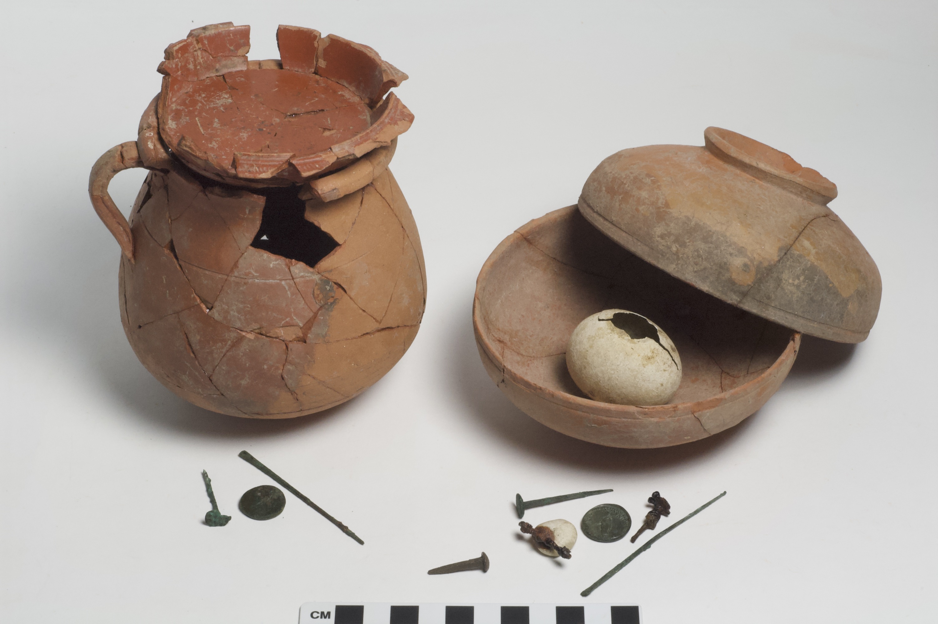 These items were found in Sardis. They are thought to have been placed there as a votive offering. The bronze coin, minted under Nero, has an image of the god Zeus Lydios, a local god of storms and thunder, probably chosen specially as a plea for no more earthquakes.