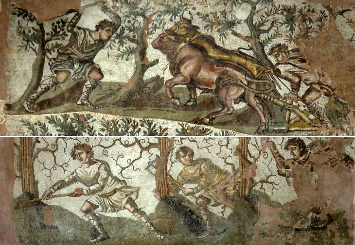 This mosaic, from Cherchell in modern Algeria, shows an agricultural scene. Two oxen are pulling a plow, preparing the ground for sowing seeds. This scene is part of a larger mosaic which depicts different stages of farming.