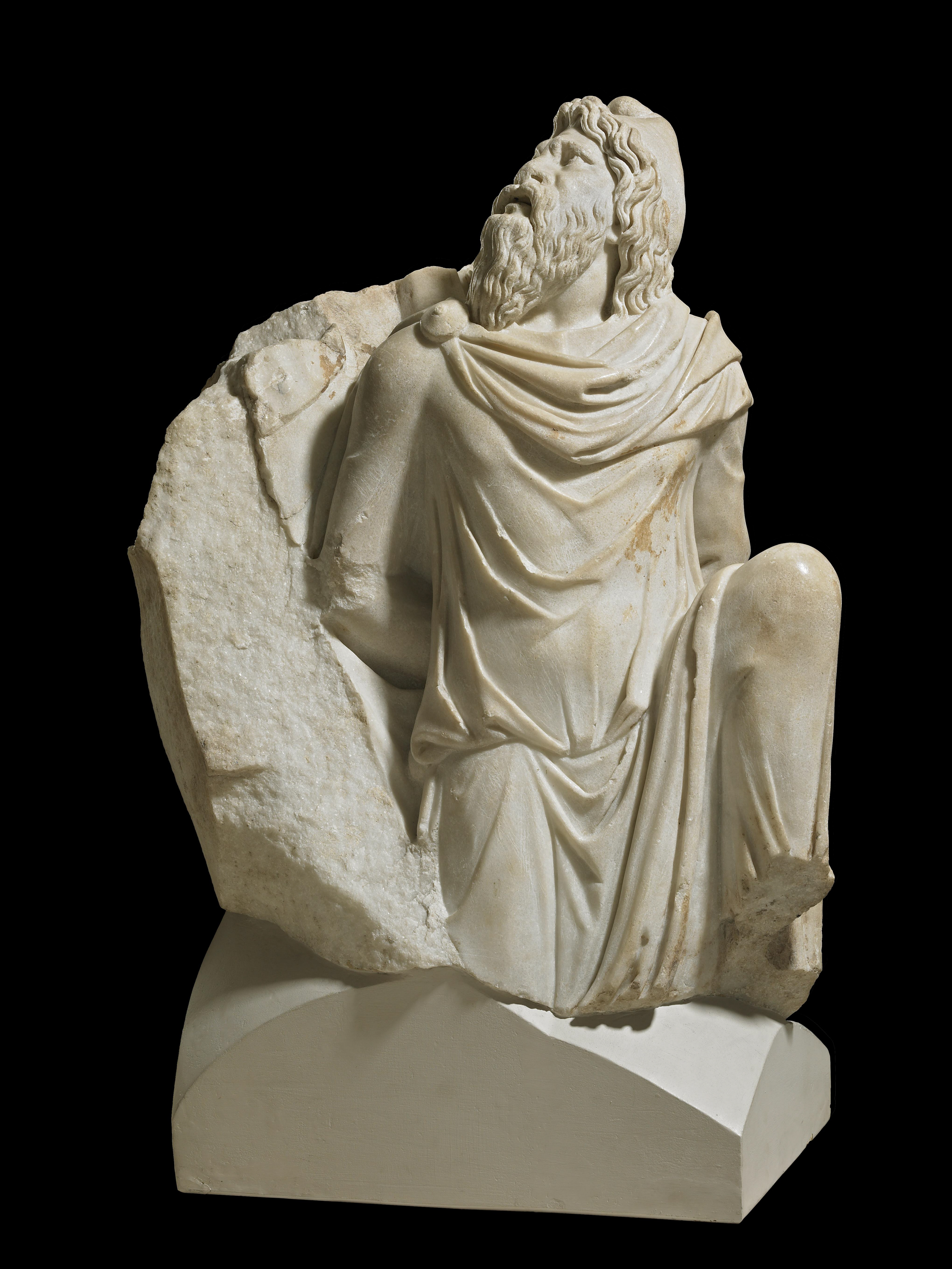 This man, probably a prisoner of war, is depicted kneeling, with his hands behind his back. The marble statue was originally part of a much larger work. It is from the palace of Trajan in Alexandria, Egypt.