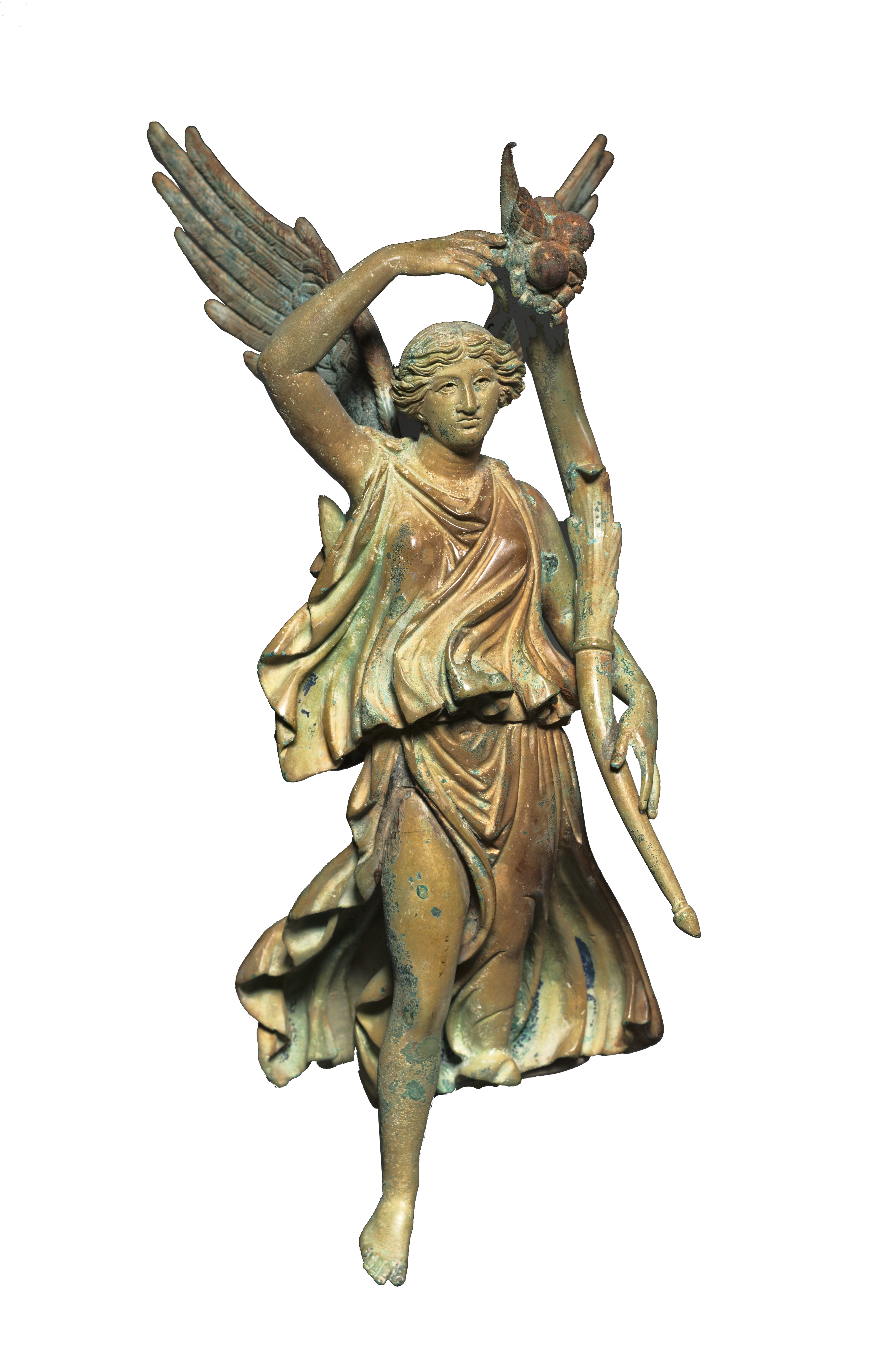 This bronze statuette shows the goddess Victoria (Victory), lightly touching down on earth. In this depiction, her arrival is not just the moment of military conquest; she brings with her the cornucopia, a horn overflowing with fruits and grains, a symbol of abundance and a portent of the peace and prosperity to come.