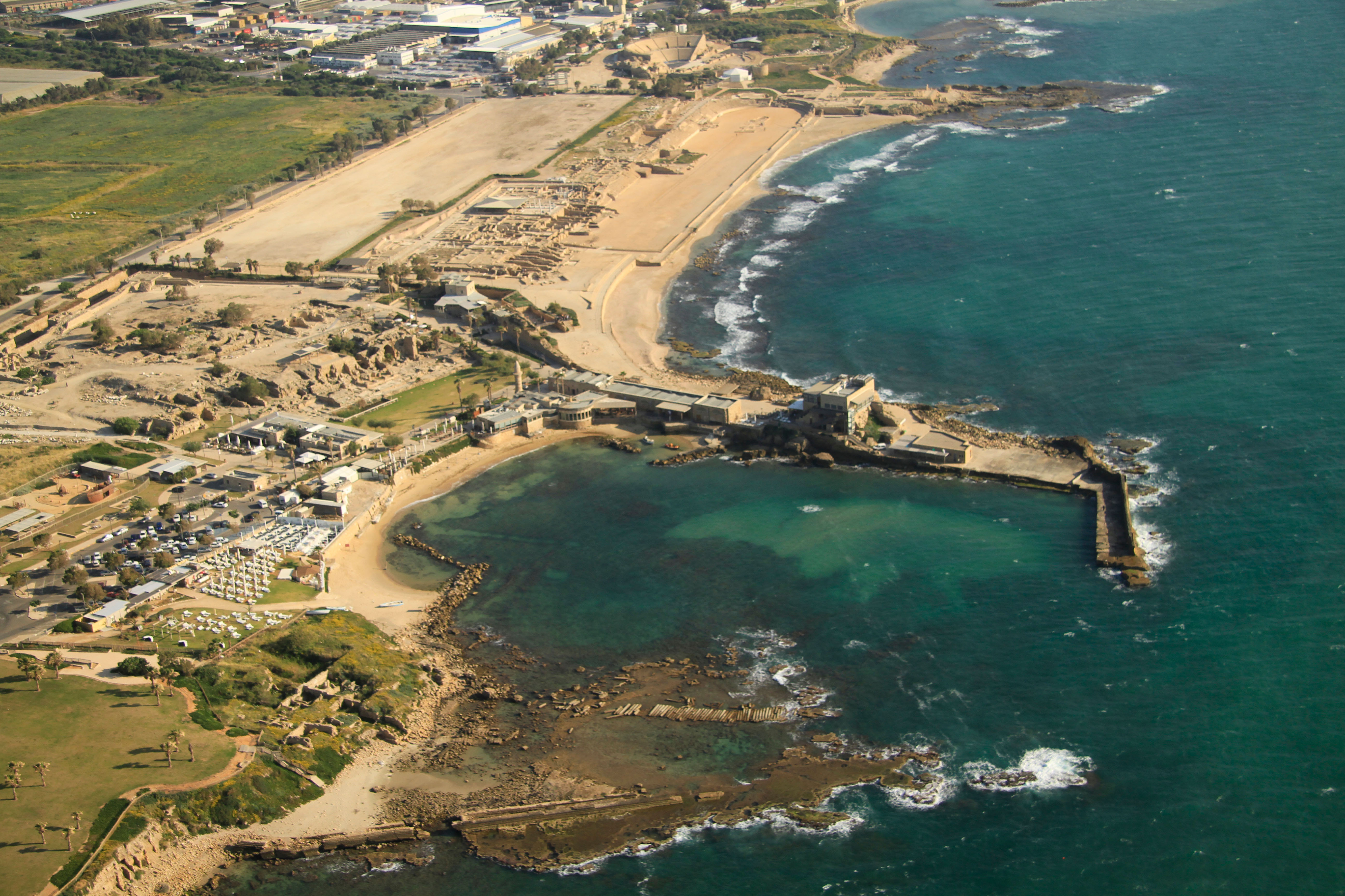 An aerial view of what remains of the harbor at Caesarea Maritima.
