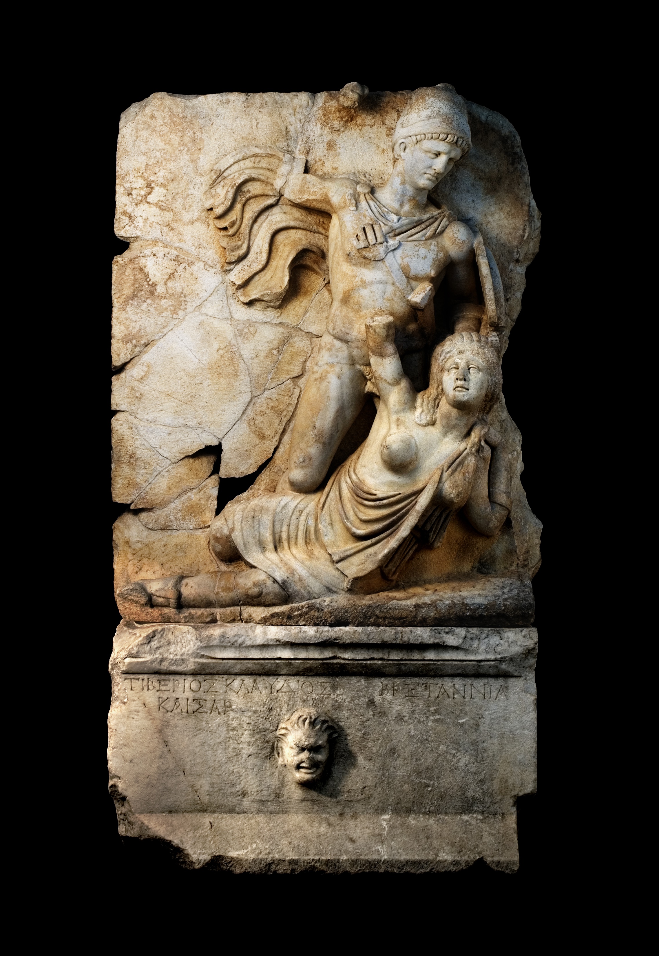 This relief is from the Sebasteion at Aphrodisias (in modern Türkiye), a temple complex dedicated to Aphrodite and to the Roman emperors. It shows Emperor Claudius overpowering a woman, a personification of Britannia.