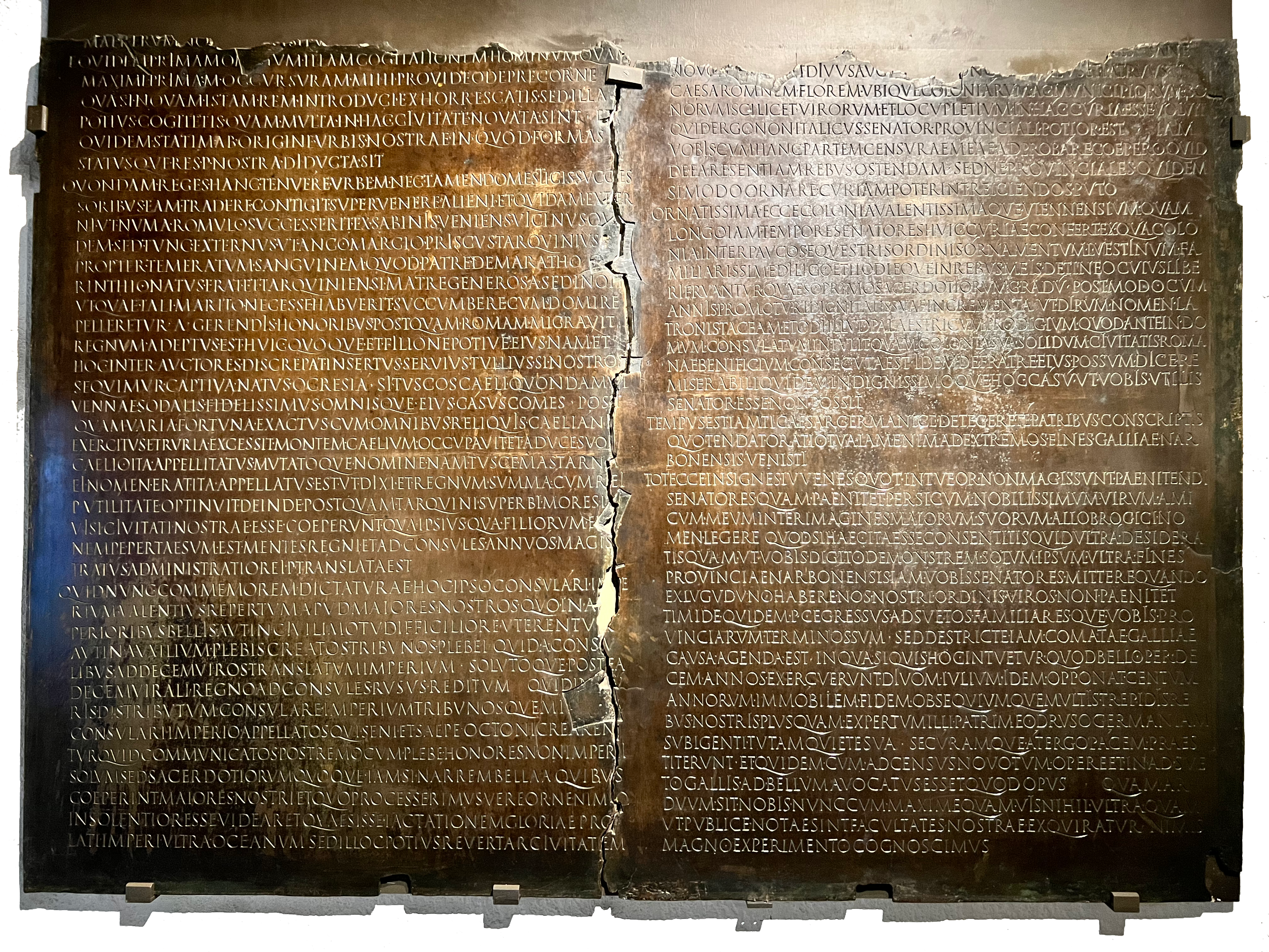 Bronze tablet found in Lugdunum (the modern city of Lyon, in France). The nobles who sent the petition to the Senate had probably met at the Sanctuary of the Three Gauls there. Only the bottom half of the original remains. The surviving part is about 6 feet wide and 41⁄2 feet tall.