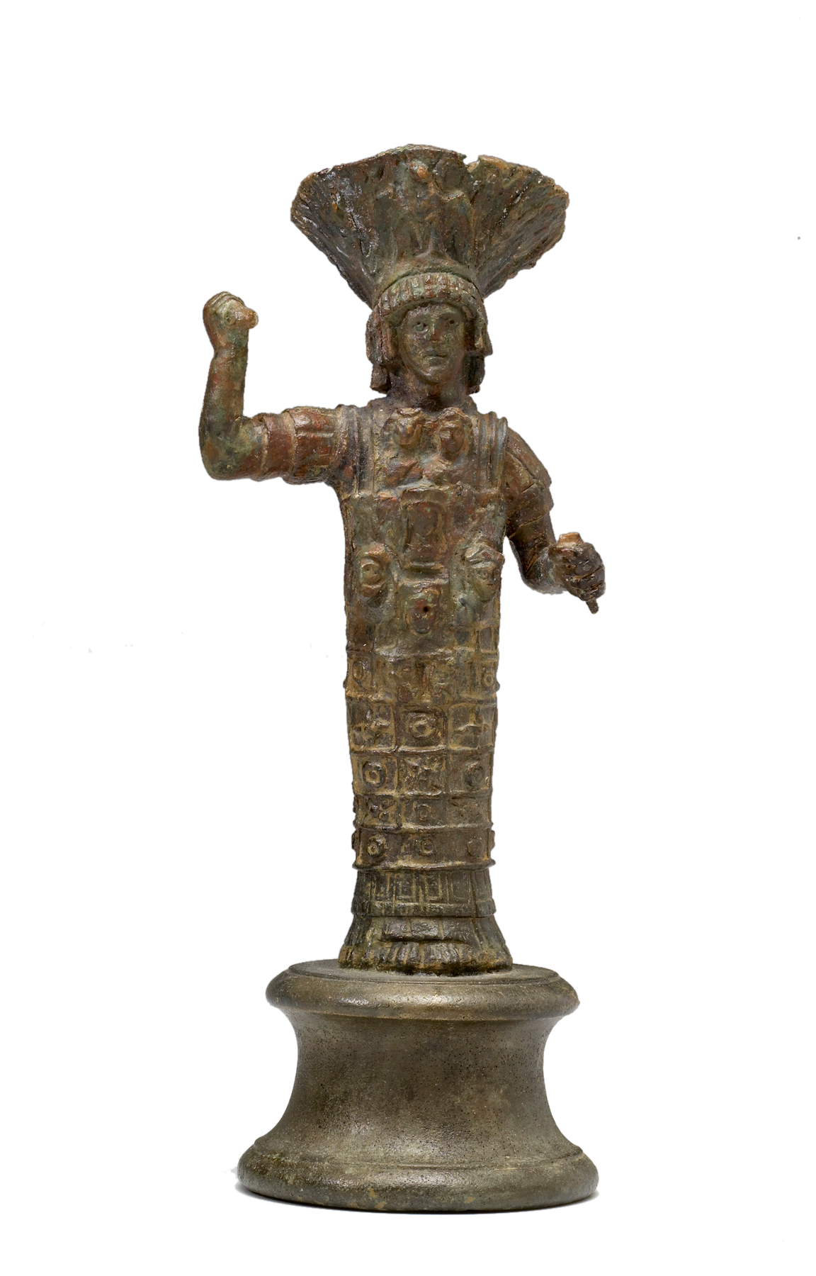 This is a bronze statuette of Zeus Labraundos, a local version of Zeus from Mylasa in Caria (part of modern Türkiye). The tall headdress with lotus motifs reflects Egyptian influence, while the eagle on its front is commonly associated with the Greek god Zeus (Roman Jupiter). This statuette was made in the first century ad.