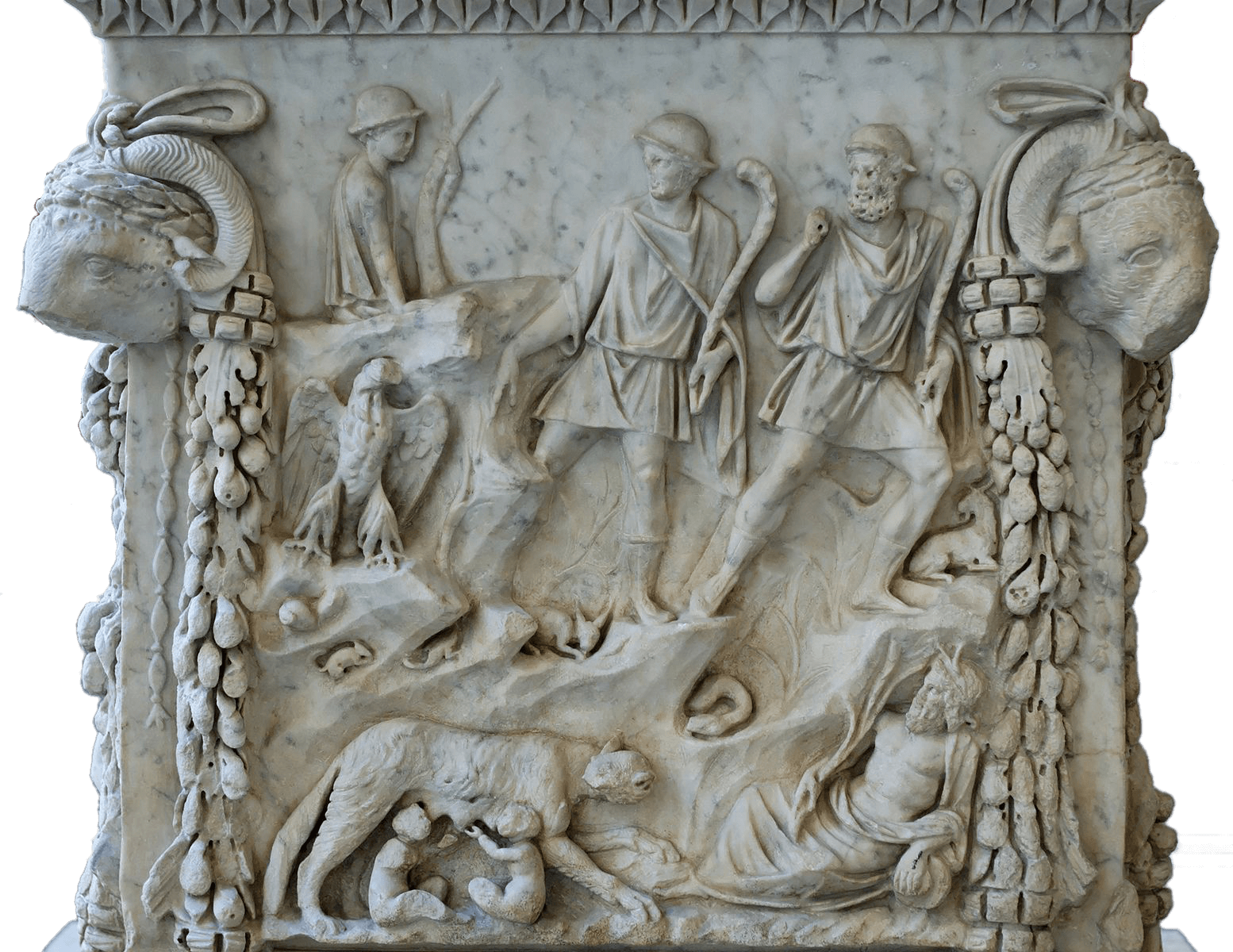 One side of a stone altar. It is intricately carved. At the bottom left a wolf suckles two young children in a cave. On the bottom right an old man with a beard reclines. Above, an eagle sits on the left and two young men wearing caps stand. On the top left a shepherd boy sits with a staff. On either side of the image are two ram heads and garlands of vines.
