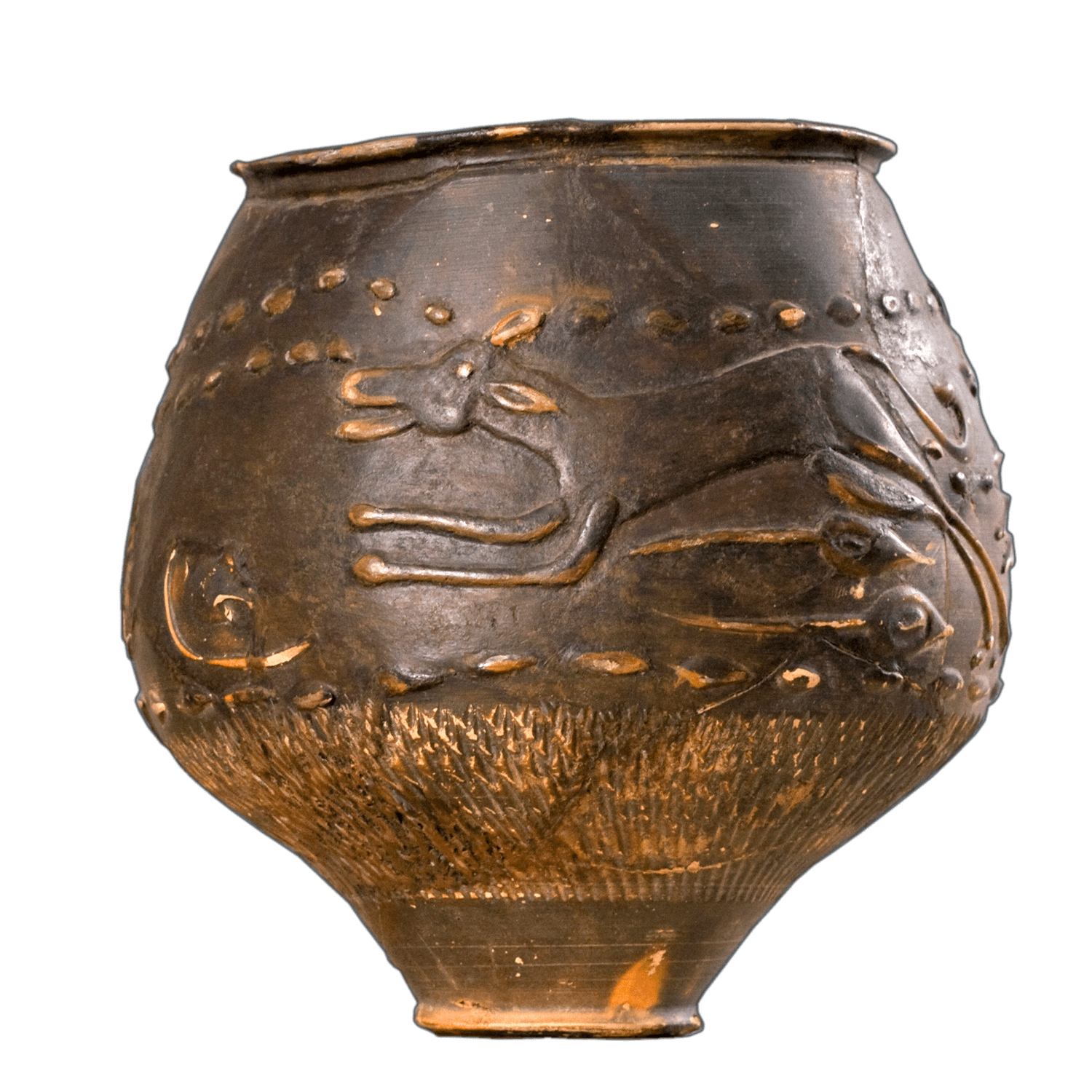 A dark ceramic cup with a narrow bottom. On the side is a dog running.